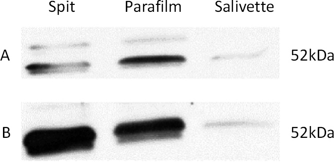 Alpha-amylase concentration on different methods of salivary collection in control group (A) and in subjects with NCCL (B), by Western Blot.