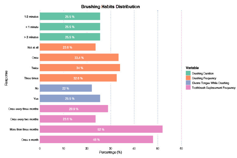 The personal preferences of the study participants for maintaining oral hygiene are presented in Table 2 and Figs. (1 and 2). Of the 377 participants, nearly half reported that they do not consider maintaining oral health necessary (188, 49.9%), 126 (33.4%) were unsure of their oral health condition, and 134 (35.5%) reported poor oral health. In contrast, 117 (31.0%) reported good oral health. Additionally, 187 (49.6%) participants had tooth discoloration, 129 (34.2%) reported experiencing bad breath, and 121 (32.1%) were unsure whether they had bad breath. Fig. (1) illustrates the distribution of brushing habits, showing that brushing frequency was nearly evenly distributed: 96 (25.5%) participants reported not brushing their teeth. At the same time, similar numbers reported brushing once or twice a day. The duration of brushing was also comparable across groups, with 126 (33.4%) brushing for less than 1 minute, 128 (34.0%) for 1 to 2 minutes, and 123 (32.6%) for more than 2 minutes. Most participants used horizontal strokes (112, 29.7%), followed by those using all types of brushing techniques (103, 27.3%), and most preferred medium bristle brushes (107, 28.4%). Additionally, most participants changed their brushes every three months (109, 28.9%). Fig. (2) shows survey responses on interdental cleansing devices, indicating that the participants did not clean their tongue while brushing (196, 52.0%), but 205 (54.4%) found interdental cleansing necessary. Furthermore, 194 (51.5%) had a flossing habit, with 106 (28.1%) flossing three times a day, and 103 (27.3%) using unwaxed floss. A total of 192 (50.9%) participants reported interdental brushing, and 196 (52.0%) experienced gum bleeding when using an interdental cleansing device. Awareness of tooth decay causes was reported by 171 (45.4%) participants, 189 (50.1%) cleaned their teeth after eating sweets, and 198 (52.5%) did not follow their dentist’s advice, with 189 (50.1%) not having learned brushing techniques from a dentist.