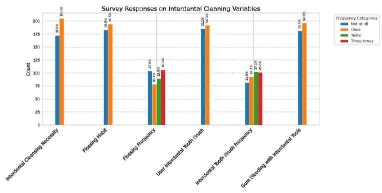 Statistical analysis was conducted using SPSS version 27. Descriptive statistics were used to calculate frequency distributions among participants regarding their demographic information, Personal Preferences for Oral Hygiene, and their perception and acceptance of new interdental devices.