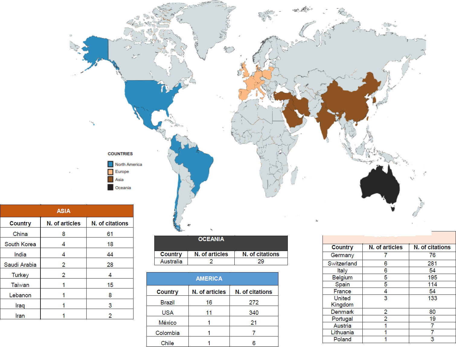 Based on the corresponding author's country, the 100 most cited articles originated from 26 countries. Brazil ranked first with 17 articles, followed by Germany with 14 and the United States with 10. A total of 47 articles came from 11 European countries (Germany, Switzerland, Belgium, Spain, Denmark, the United Kingdom, Italy, France, Portugal, Lithuania, and Poland). Ten Asian countries (China, India, Taiwan, South Korea, Lebanon, Saudi Arabia, Iraq, Iran, the United Arab Emirates, and Turkey) contributed 22 articles. The Americas accounted for 20 articles from five countries: Brazil, the United States, Mexico, Chile, and Colombia.