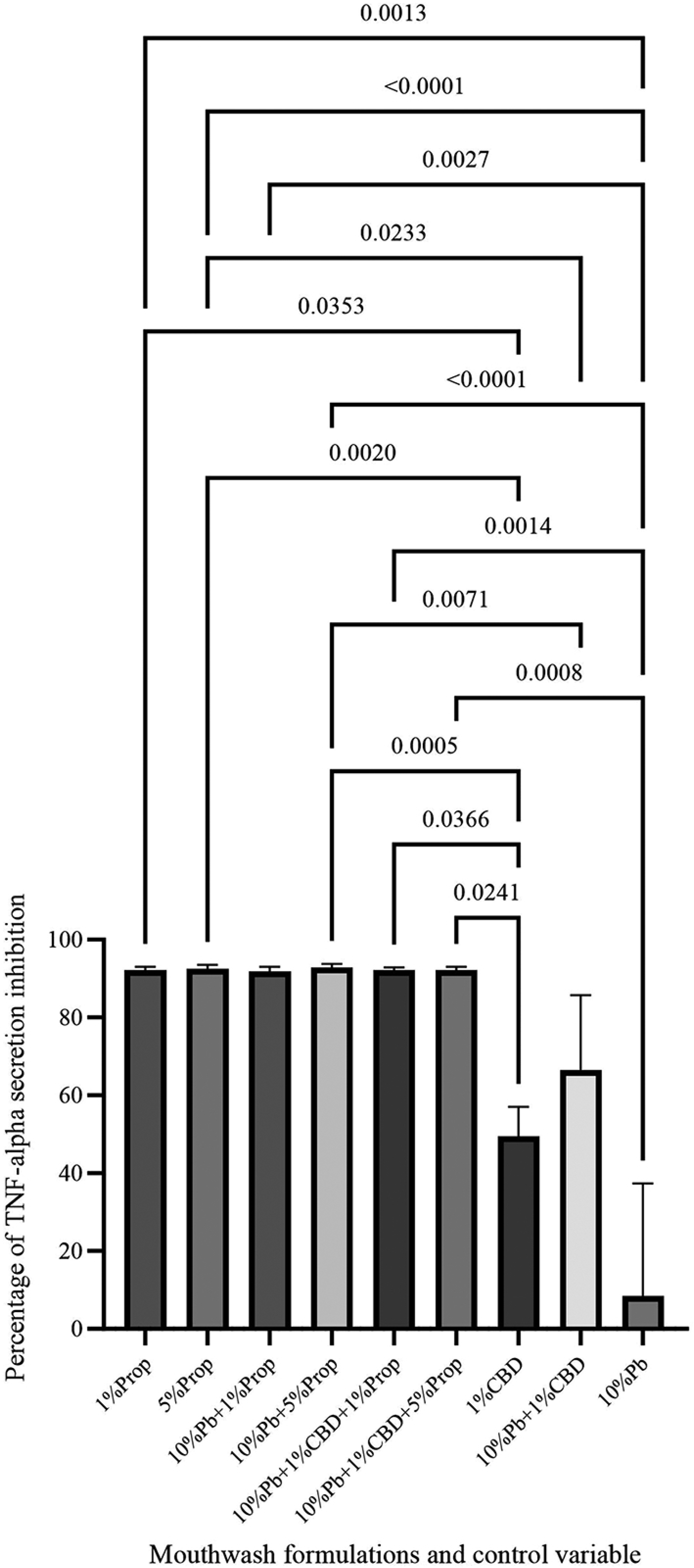 Probiotic mouthwashes containing propolis, as well as those formulated with both cannabis extract and propolis, demonstrated statistically significant inhibition of TNF-α secretion compared to the probiotic culture alone, with a confidence level of 95%. In addition, these formulations exhibited a higher percentage of TNF-α inhibition than the probiotic mouthwash containing 1% cannabis extract, highlighting the enhanced anti-inflammatory potential when propolis was incorporated into the formulation.