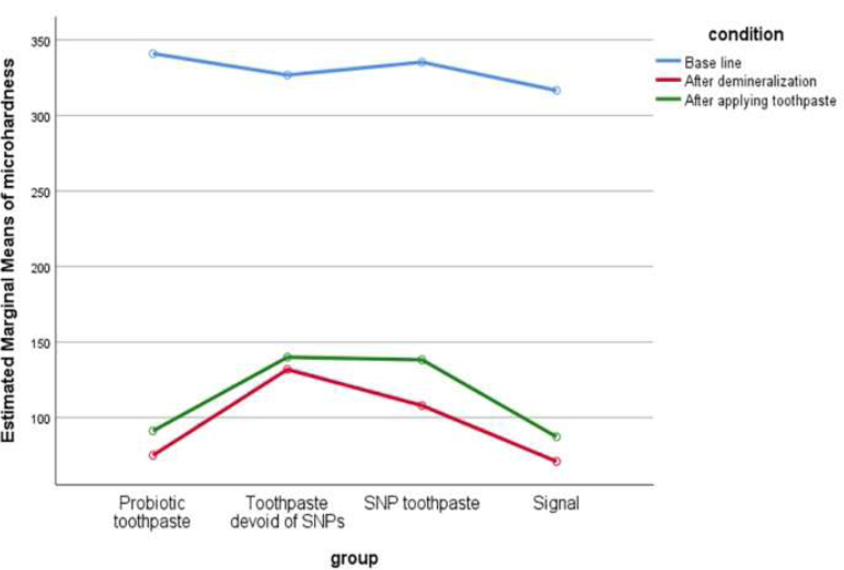 Mean Vickers Hardness Numbers (VHN) for the three measurement points are shown in Table 4. Two-way repeated measures ANOVA revealed a highly significant effect of time (p < 0.001), confirming that the demineralization and treatment cycles significantly altered enamel microhardness. There was no significant main effect of toothpaste type (p = 0.367) and no significant interaction between toothpaste group and time (p = 0.456).