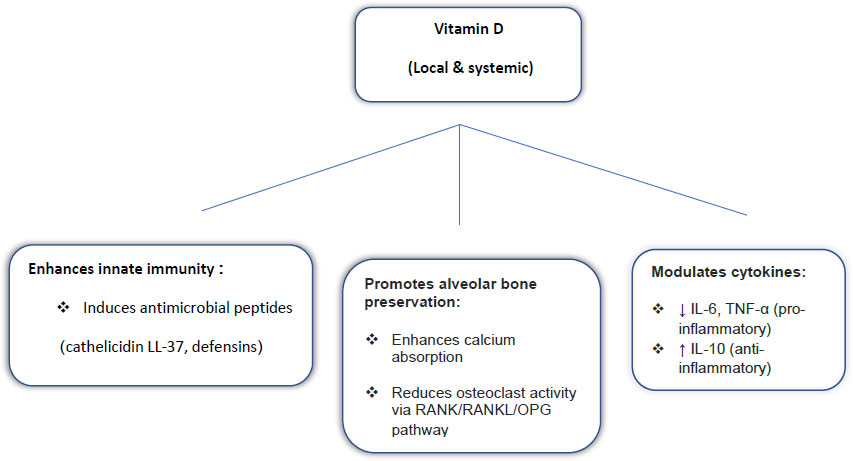 The biological plausibility of these findings is underpinned by vitamin D’s immunomodulatory and bone-regulating properties. Vitamin D enhances innate immunity through antimicrobial peptides such as cathelicidin (LL-37) and defensins [28, 29], regulates inflammation by downregulating IL-6 and TNF-α while upregulating IL-10 [30], and preserves alveolar bone by influencing calcium absorption and modulating the RANK/RANKL/OPG pathway [31, 32]. These mechanisms-schematically summarized in Fig. (4)-illustrate how insufficient vitamin D may intensify periodontal inflammation and alveolar bone loss.