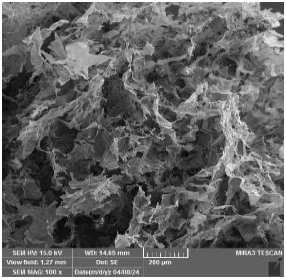 SEM micrograph of nettle-loaded alginate hydrogel (magnification: 100×), showing a highly porous microstructure with abundant cavities and interconnected channels. (SEM HV: 15.0 kV, WD: 14.65 mm, scale bar: 200 µm, device: MIRA3 TESCAN, Date: 24/08/04).